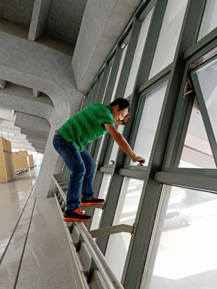 主站樓部分是攻堅(jiān)之戰(zhàn),30位員工在透明的頂棚下感受悶熱灼曬、揮汗如雨,每一塊地磚都是經(jīng)過了水沖、塵推、除塵、清洗、抹凈、擦干等六道工序,方可達(dá)標(biāo)。上下兩層共26912平方米,經(jīng)過兩天半的時(shí)間終于完工,看著光亮如新、纖塵不染的候車廳,所有員工的臉上都綻放了發(fā)自內(nèi)心的微笑。