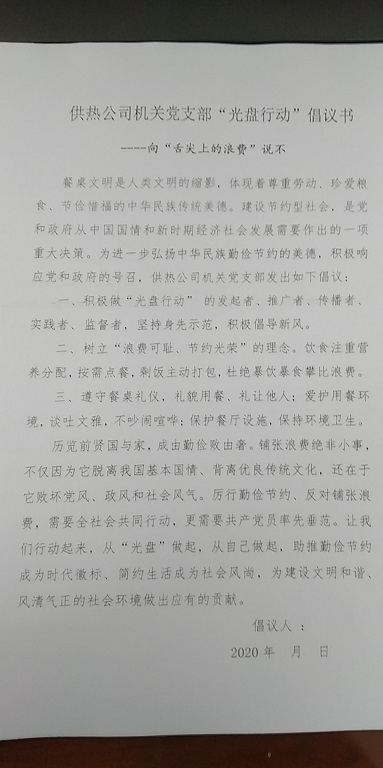 為了進一步弘揚中華民族勤儉節(jié)約的美德,積極響應(yīng)黨和政府的號召。9月9日上午開始,城發(fā)供熱公司機關(guān)黨支部黨員、發(fā)展對象、積極分子共40人陸續(xù)簽署“光盤行動”倡議書。