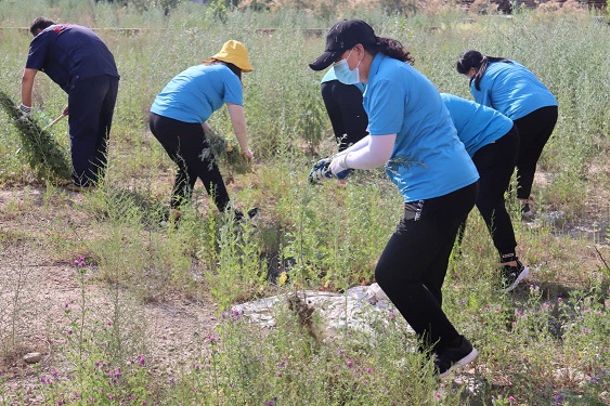 活動(dòng)現(xiàn)場(chǎng),黨支部書(shū)記娜仁、經(jīng)理史濤帶領(lǐng)大家在各自的責(zé)任區(qū)域內(nèi)分片作業(yè)。大家在炎炎烈日下,揮汗如雨、干勁十足,有的拔除蒿草、有的收集清運(yùn)……經(jīng)過(guò)一下午地辛勤作業(yè),小區(qū)及周邊的蒿草不見(jiàn)了,空氣清新了,環(huán)境也變美了。
